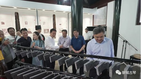 領導嘉賓對編鐘編磬“一見鐘情”,紛紛上前,敲響這自2400多年前就響徹華夏的中國聲音!大家在周達老師的引導下,參觀了雅樂琴文化展廳、衣冠華夏廳、古琴非遺傳習所、書畫創作展示以及斫琴體驗廳等區域。并且駐足鑒賞園區內每一副牌匾及楹聯,給予高度贊賞! 聊城古琴藝術館,打造集琴文化展示、斫琴體驗、非遺傳習、古籍研究、書畫創作于一體的文化新空間,既為廣大古琴愛好者提供一個學習展示交流的專業平臺,又能為市民群眾和外地游客帶來更加直觀的視聽體驗。