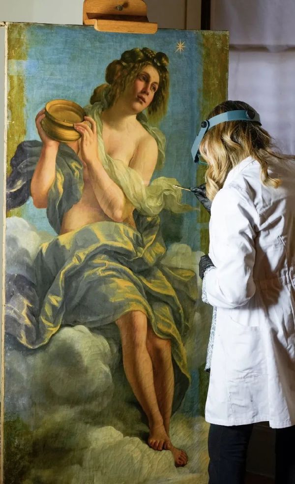 這幅壁畫由米開朗基羅的侄子委托 Gentileschi 創作,描繪一名手捧指南針的年輕女性形象。原始版本中的女性未著衣物,1684年被重繪添加薄紗以遮蓋裸體。本次修復將通過X射線、紫外線和紅外線掃描技術尋找畫家的原始筆觸,嘗試模擬還原出畫作的原貌。