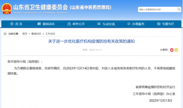 山東省衛健委官網13日晚發布《關于進一步優化醫療機構疫情防控有關政策的通知》: