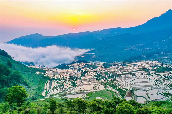 位于元陽縣境內(nèi)的多依樹梯田,是觀看日出的絕佳地點(diǎn)。哀牢山重巒疊嶂,萬畝梯田鑲嵌其中。