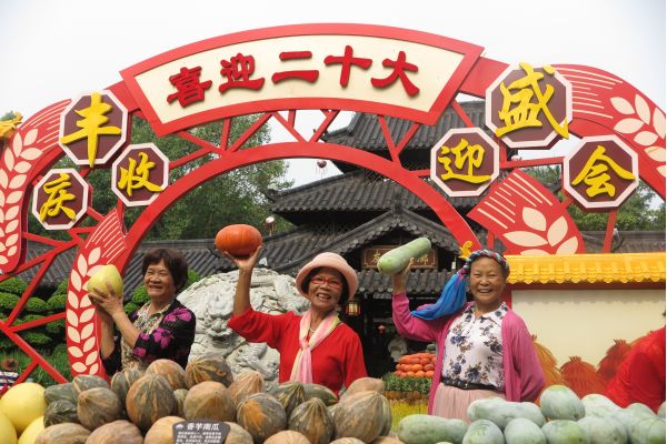 約2萬株水稻打造成的“20”字樣的豐收稻浪、掛滿瓜果的棚子、摞滿蔬菜的籃子……秋日的東盟友誼園內,一處處豐收的場景吸引了眾多游客打卡拍照。豐收節活動現場,設置了特色農作物展示區、農具展示區及家禽類品種展示區。游客可以親手推石磨體驗勞動的快樂,孩子們可體驗投喂兔子、珍珠雞、火雞等家禽的樂趣。