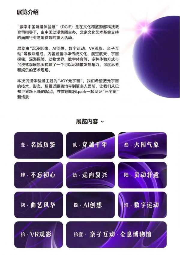 據了解,此次展覽由沉浸影像、AI創(chuàng)想、VR觀影、數(shù)字運動、親子互動等板塊組成,涵蓋中國傳統(tǒng)文化、航空航天、宇宙探秘、深海探險、動物世界、數(shù)字體育等內容,讓觀眾在娛樂互動中沉浸式感受博大精深的中國傳統(tǒng)文化,體驗足球、射箭等運動樂趣,重溫南昌起義、遵義會議等歷史場景,盡享“科技+”魅力。