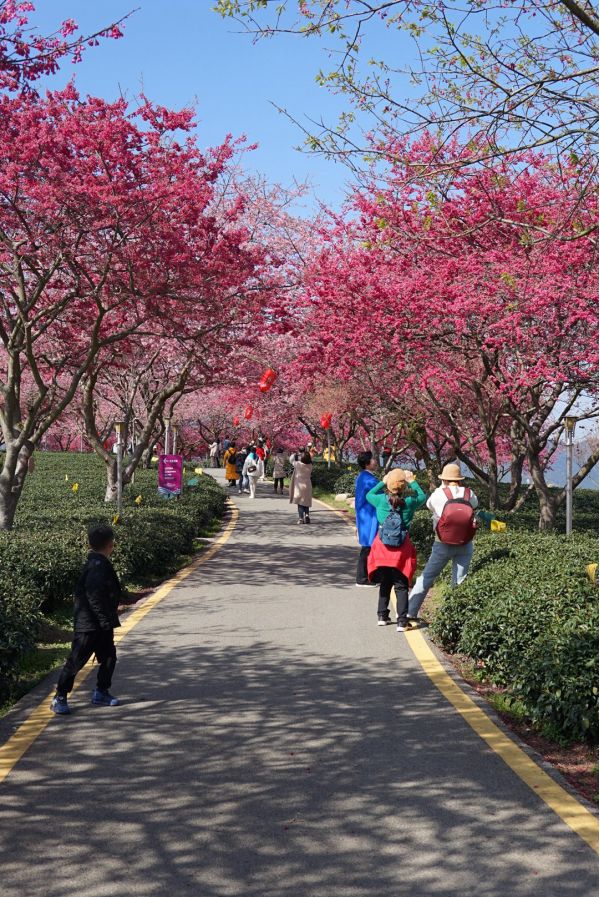 這里的櫻花與別處的櫻花有著很大的區(qū)別。別處的櫻花雖然是一處處一叢叢,但一般都種植在土里,從下往上拍照就顯得不太美觀。臺(tái)品櫻花茶園的櫻花和高山茶山相映成趣,構(gòu)成了無(wú)論從哪個(gè)角度拍都能完美出片的特有氛圍,粉色櫻花鑲嵌在漫山翠綠的茶園中,十里茶道,一片花海。乘坐櫻花樹(shù)下的小火車(chē),從櫻花茶叢中緩緩駛過(guò),撲面而來(lái)的是茶香花香,偶爾能看到茶農(nóng)們?cè)诓栝g勤作,這美景都是出自這一雙雙勞動(dòng)的手,在這獨(dú)特的景觀帶上,心中滿(mǎn)是對(duì)春天的憧憬,坐著享受春天的愜意與美好。