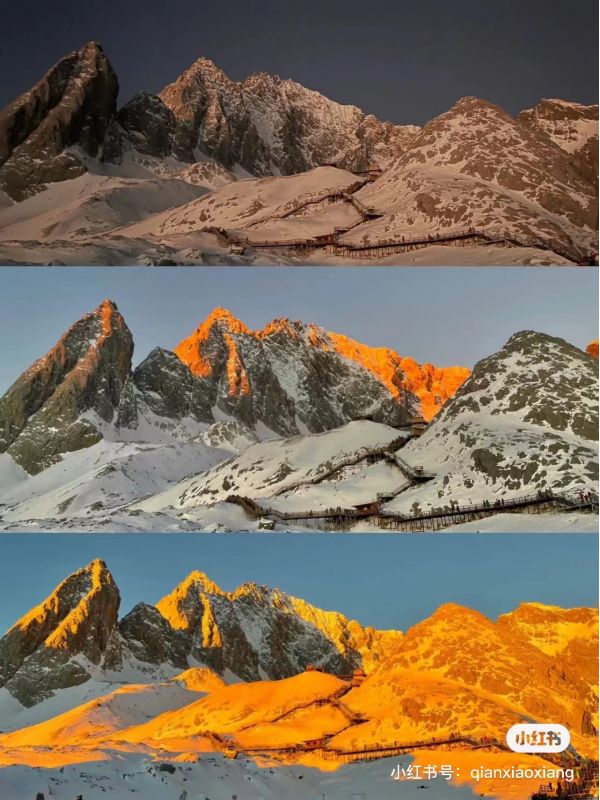 2.當2023年的日光再次照射玉龍雪山,當你在4680米的高度,與云海一起見證日照金山的奇跡;當中國無限壯闊的天地,讓你在人海里熱淚盈眶;當每一次向上的腳步 在心中蕩起回響,彩云之南,數永遠是詩和遠方..來麗江,不去玉龍雪山,是一種遺憾…..玉龍雪山有終年不化的積雪,么皚皚白雪,脈脈山巒;這里的夜晚,云層開闊,星河璀璨;在雪山的懷抱中,迎著朝陽眺望,伴著星河入眠,這是玉龍雪山獨有的浪漫。
