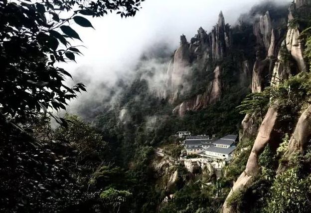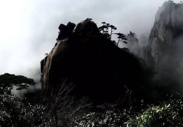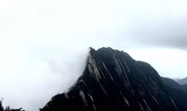 怪石高聳直入云端,云霧白蒙縈繞山身。