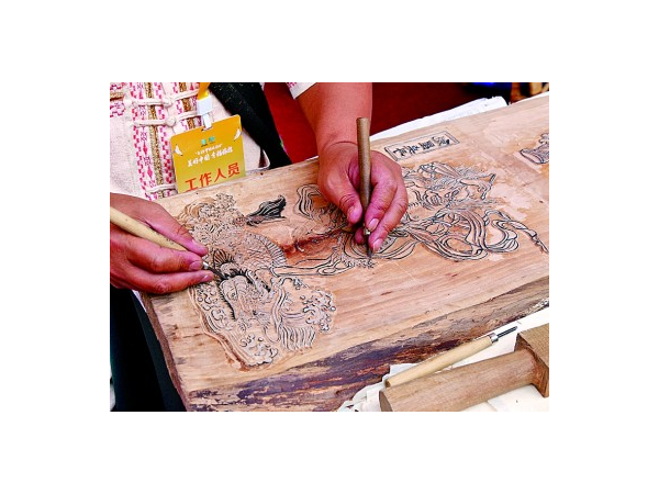 “您在雕刻什么?我能體驗一下嗎?”“把印版放平,刷好顏料,再把紙端正地放上去……”騰沖農民畫傳承人賈明安一邊帶游客體驗印甲馬,一邊介紹:“甲馬在古代是用來祈福祭祀的,后來逐漸成為雕版藝術。騰沖有悠久的木刻雕版印刷歷史。”他指著一旁未雕刻完的作品說,“喏,完成這樣一幅作品要五六天。木頭多選用結構細膩、木質良好的梨木,這樣才能雕刻出精細的圖案。”你一言我一語的對話間,游客在賈明安的幫助下既體驗到了印甲馬的過程,又對騰沖甲馬這項非遺項目有了更多了解。