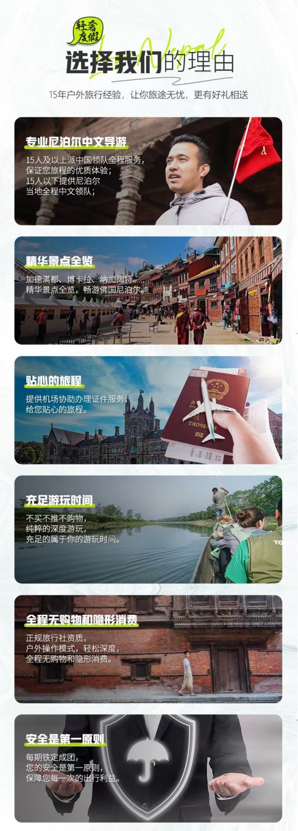 4.導游服務:15人及以上派中國領隊全程服務,保證您旅程的優(yōu)質體驗;15人以下提供尼泊爾當地全程中文領隊(成都機場有送機人員協助辦理登機牌、出發(fā)手續(xù))。