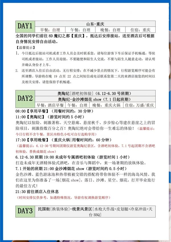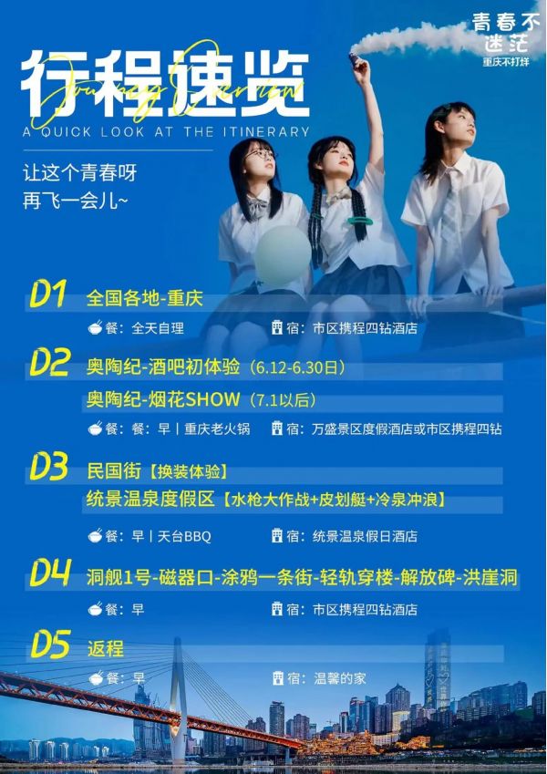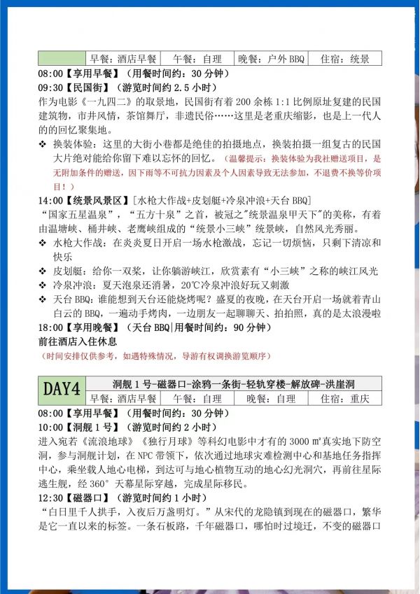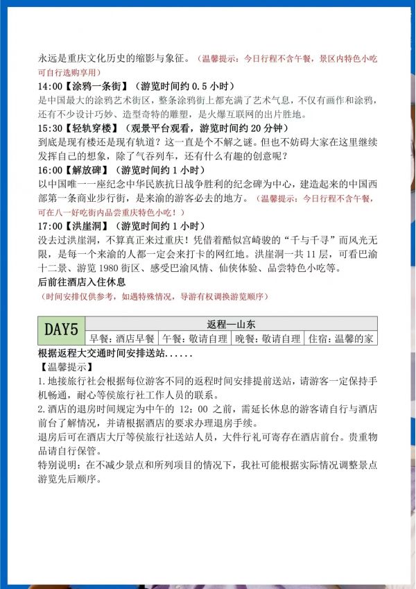 重慶雙飛5日游 聊城發(fā)團 純玩 無購物 重慶奧陶紀題公園 統(tǒng)景風(fēng)景區(qū) 民國街 黃桷坪涂鴉街 中山四路 洪崖洞 磁器口 輕軌穿樓 ...... 發(fā)團日期 2023061620230621 價格 3990 報名電話 0635 8681234