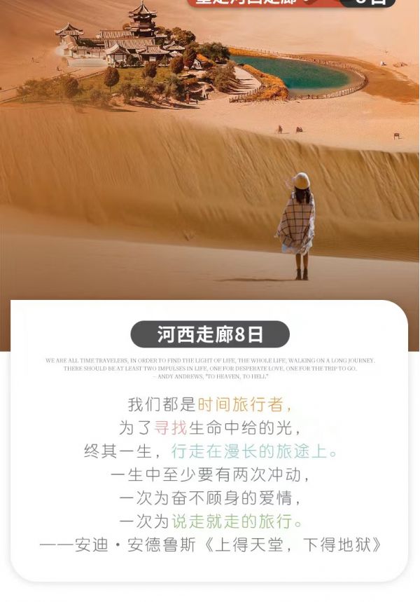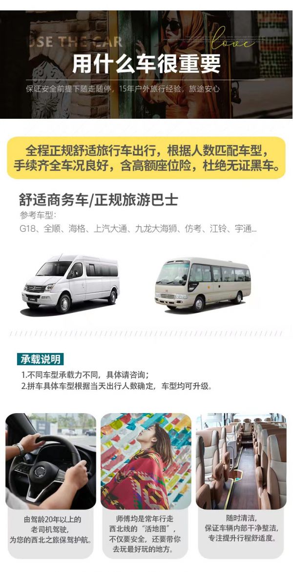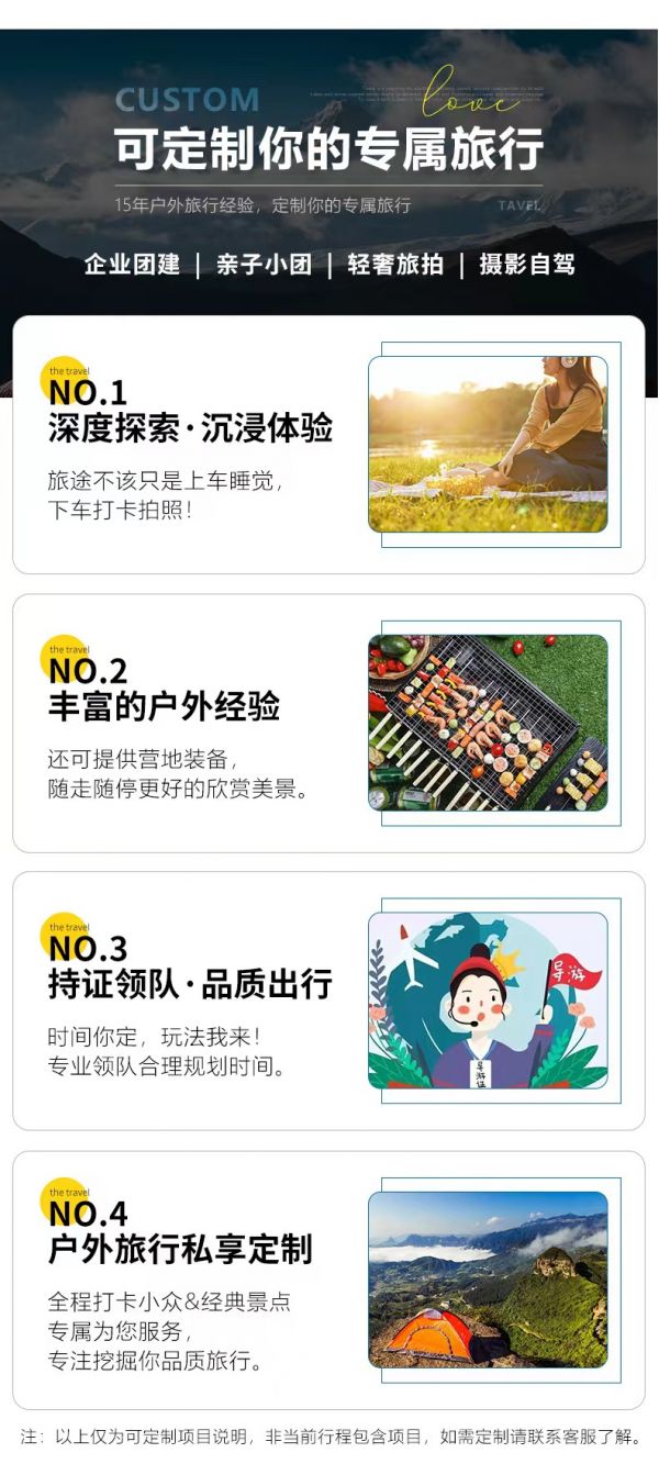 私人訂制:我們業務范圍囊括了全國各大城市,川西、西北、新疆、西藏,在路上永遠有我們的身影。我們將為每一個有定制需求的你策劃出獨屬于自己的完美旅行。