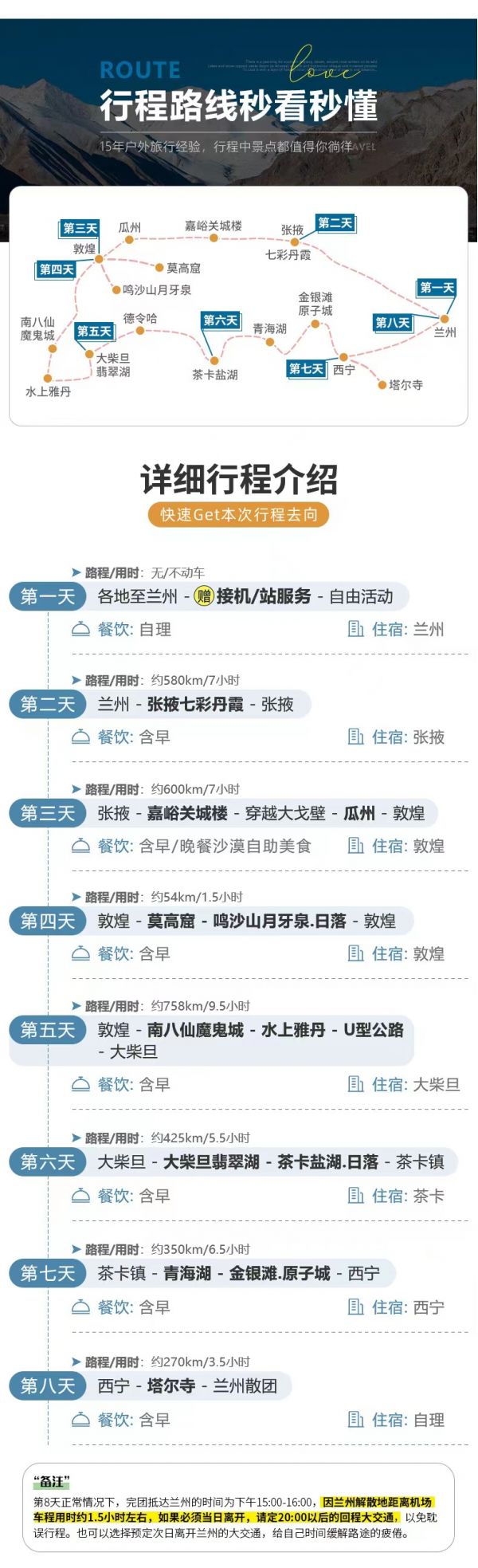 (5)贈送2人及以上蘭州市區接火車服務;4人以上接機服務,23點后由于運管規定不能接機/接站,敬請諒解;服務:9人及以上,提供持證正規導游服務;8人及以下,由經驗豐富的司機帶隊,無單獨導游服務,請諒解。保險:贈送高額旅游意外保險,旅游意外保險最高賠付50萬元/人,贈送旅行社責任險,贈送車輛保險;因道路交通事故造成的客人意外傷害,按《道路交通事故處理方法》由保險公司賠償,我方不承擔另外的賠償責任;如有需要,游客可自行購買其他保險。