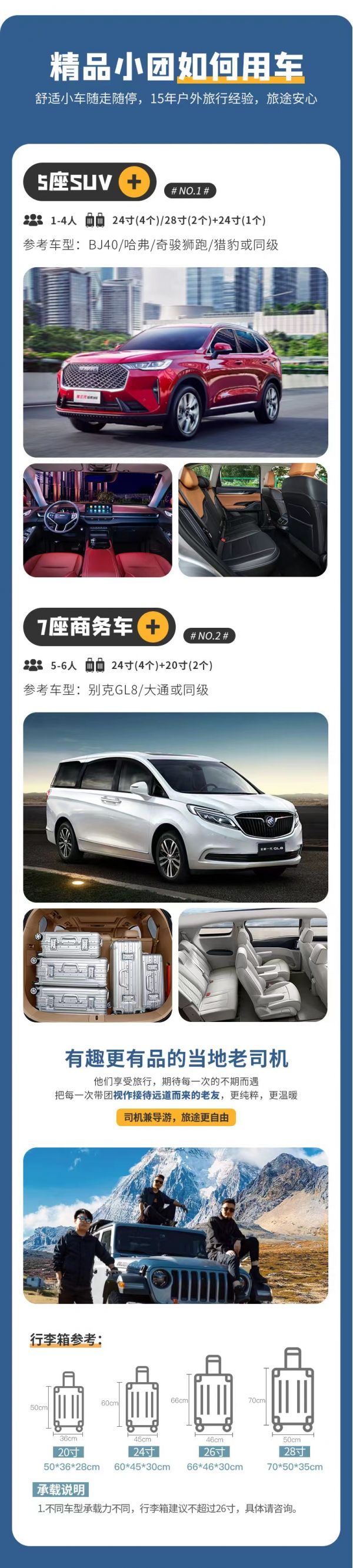 交通:2-6人VIP私享小團全程舒適SUV/商務車出行;車型大小根據(jù)實際人數(shù)安排,且由駕駛經(jīng)驗豐富的司機為您的出行保駕護航,報價包含車費、油費、停車費、維修費及司機勞務費。