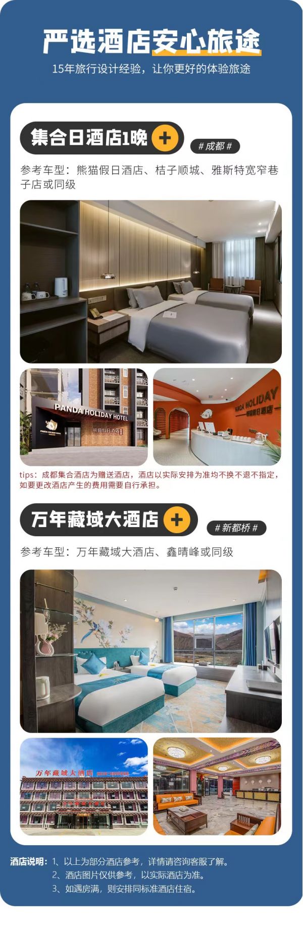 住宿:成都酒店標間1晚(tips:成都集合酒店為贈送酒店,酒店以實際安排為準均不換不退不指定,如要更改酒店產(chǎn)生的費用需要自行承擔。),新都橋酒店標間2晚,上木居/玉龍西客棧標間1晚 (冷噶措住宿條件有限,請謹慎報名)(僅供參考,實際以訂房為準):