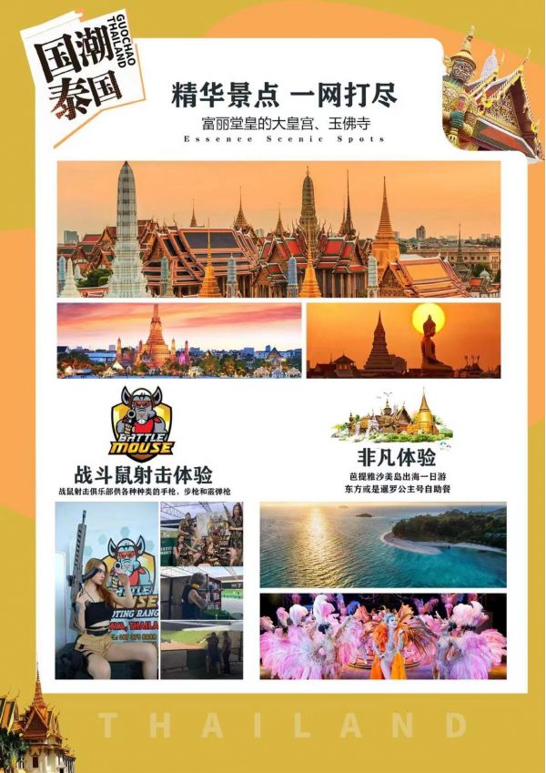今日安排:早餐后前往,【四面佛】泰國是佛教國家,全國大大小小的佛寺數不勝數。四面佛,人稱“有求必應”佛,該佛有四尊佛面,分別代表愛情、事業、健康與財運,掌管人間的一切事務,是泰國香火最旺的佛像之一。正面求生意興隆,左面求姻緣美滿,右面求平安健康,后面求招財進寶。對信奉佛教的人來說,到曼谷來不拜四面佛,就如入廟不拜神一樣,是一件不可想象的事。據說四面佛的靈驗超乎尋常,因此,有些游客為了在四面佛前許誓還愿而多次往返泰國,更有許多港臺影視明星,年年都來泰國膜拜四面佛,可見四面佛的魅力。前往【KINGPOWER國際免稅店】 此為泰國最大的免稅商店,各種國際頂尖名牌商品,歐萊雅、雅斯蘭黛、香奈兒、蘭蔻、迪奧、施華洛世奇等等在這里都有專柜展覽,并不定期提供特別折扣,客戶在曼谷市區購買即可在機場直接取貨,不想買名牌的可以一飽眼福,還可以購買土特產贈送親朋好友,更是不可錯過的好機會?!締痰乱故蠮oddFairs】(約120分鐘),泰國各地夜市繁多,來泰國怎能錯過當地的夜市,泰國的夜市就像一個寶藏,在此不僅可以尋覓到當地特色美食,穿梭于人群與煙火,還能充分的感受到泰式生活的慢與漫