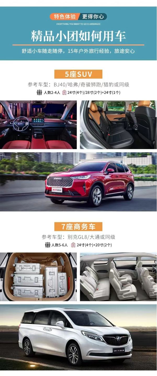 交通:2-8人VIP私享小團,全程舒適商務車出行,車型大小根據實際人數安排,保證一人一正座位,且由駕駛經驗豐富的司機為您的出行保駕護航,報價包含車費、油費、停車費、維修費及司機勞務費;