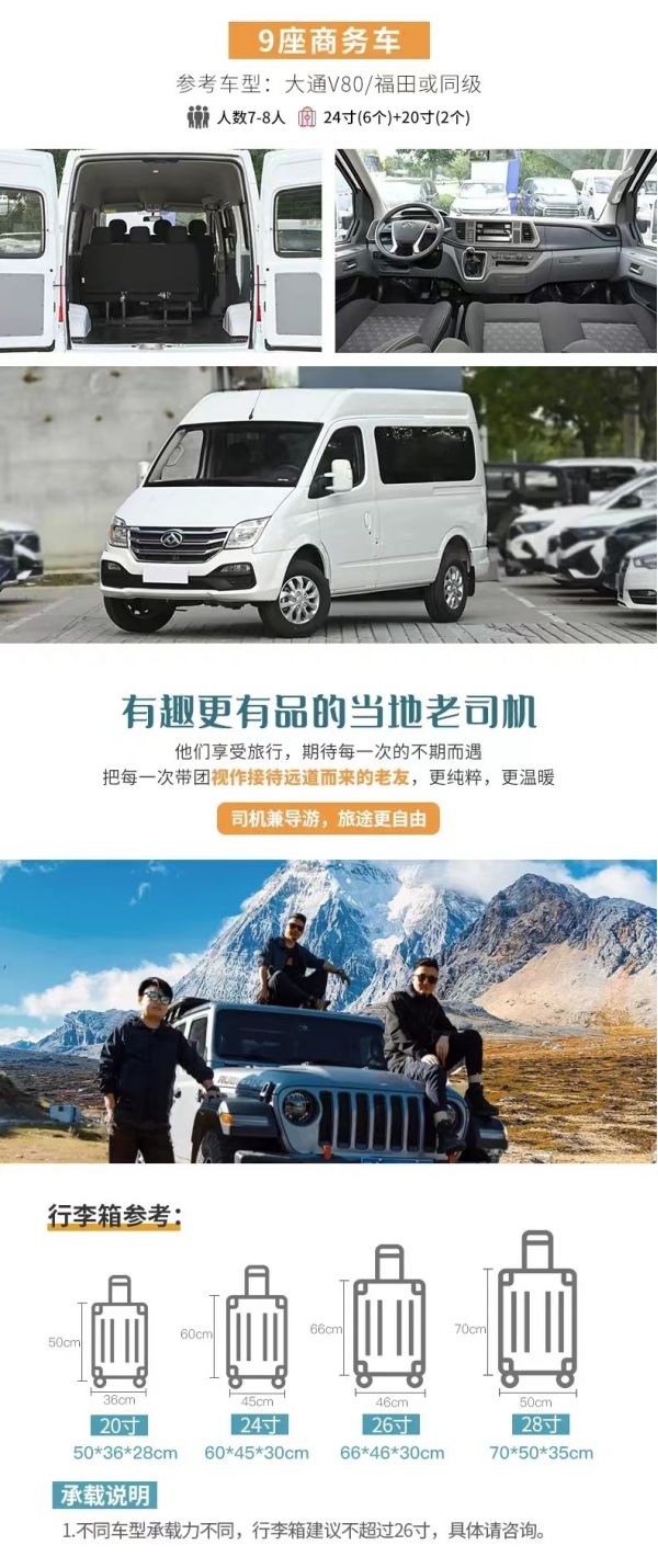 1、關于車輛交通:目前四川旅游市場8座以下車輛無法辦理旅游牌照,請游客知悉,以此理由提起的投訴我方拒不受理,望您諒解。