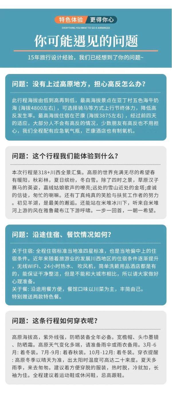 本線路屬于特種線路,涉及高海拔地區,5 歲以下幼兒及70以上(含 70)老年人請勿前往(65歲以上的游客需要出示健康證明),您的安全是第一原則,望您諒解;有心臟病、高血壓、哮喘、心腦血管疾病、血液系統疾病、精神疾病等不能前往高原疾病患者請勿前往;參團前需向我方提供真實身體狀況說明,如因游客隱瞞疾病或年齡參團,我方有權取消合同并遣返,行程所有費用不予退還,且因此產生的其它費用、造成的任何后果由游客自行承擔,我方不承擔任何責任,望您諒解。