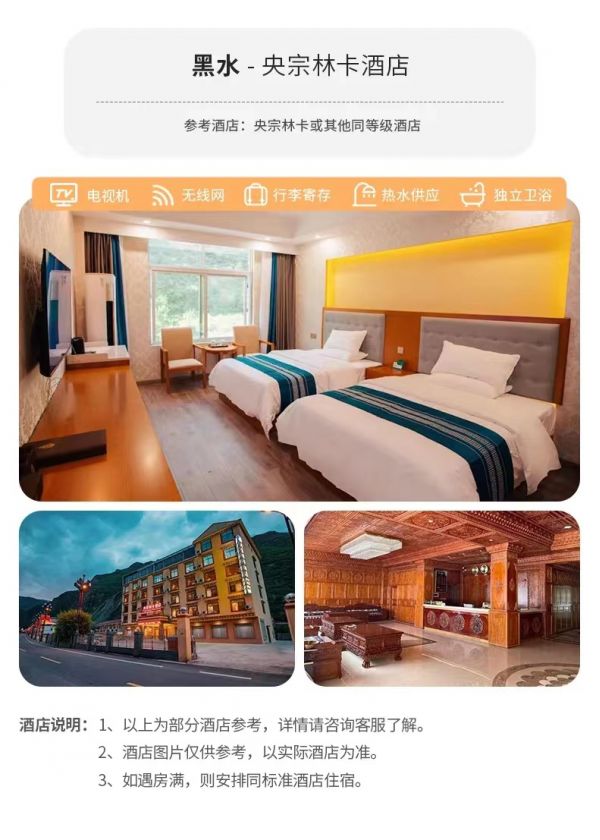 住宿:黑水酒店標間說明”早餐后經米亞羅、鷓鴣山隧道,隨后來到奶子溝,秋天的【奶子溝】是彩林的世界,在雄奇的冰川下、美麗的雪山上、獨特的藏寨邊、蜿蜒河流旁均有成片的彩林分布,是亞洲最大的天然彩林,享有“八十里畫廊”的美譽。游覽拍攝之后車繼續前行,沿途會經過一個叫【洛哩措】的地方,這里像是一塊地球送給我們的綠寶石,陽光和煦、波光粼粼,連掠過的風,都是自由的。隨后來到【羊茸哈德藏寨】,當地人叫“冬巴嘎”,意思是“神仙居住的地方”,清一水的藏式民居坐落于彩林間,彩色的窗沿點綴著整個建筑,色彩素雅又歡快。藏寨碧水潺潺、林蔭繁茂、彩林環繞、色調分明、鱗次櫛比,這里的藏人服飾獨特,淳樸善良,隨處可見神秘的宗教符號,五彩的藏家建筑與七彩經幡交相輝映,有著濃郁的嘉絨藏族風情。