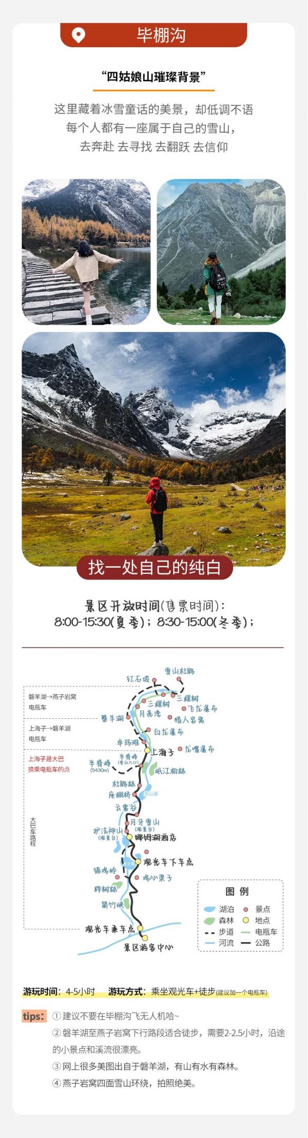 ? 美麗的山水世界【畢棚溝景區(qū)】(游覽時間3-4小時)換乘景區(qū)觀光車,觀賞古樸的原始風(fēng)光,海龍王潭、女皇峰、娜姆湖、神女十二蜂、盤羊湖,美景讓您流連忘返, 這與大自然最親密的接觸, 留在心里,回味一生!冬季的畢棚溝,銀裝素裹,美不勝收,滑 雪、堆雪人,打雪仗,各種雪上娛樂項(xiàng)目其樂無窮。仿佛穿行如夢如幻的冰雪童話世界,畫下你的身影,將您的祝福永遠(yuǎn)留在這里!穿梭于原始森林,眺綿延崎雪山雄峰、望飛瀉而下 的瀑布、看星羅棋布的海子、覓時有出沒的山珍野獸,夢幻般的世界讓你領(lǐng)略別樣的異族風(fēng)情。