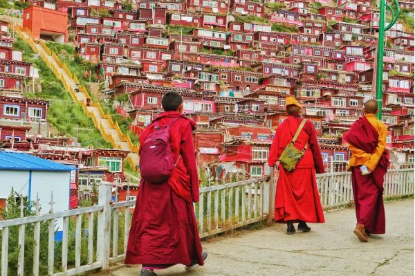 ? 震撼的佛國畫卷逐漸展開--入目處盡是朱紅的佛色,裹著紅袍的僧人在其間穿行,空氣里彌漫著佛香。在金紅相間的佛學(xué)院漫步,學(xué)著僧人面目虔誠地轉(zhuǎn)經(jīng)、朝拜,在觸動轉(zhuǎn)經(jīng)筒的旋轉(zhuǎn)中,感受“信仰”的具象化。