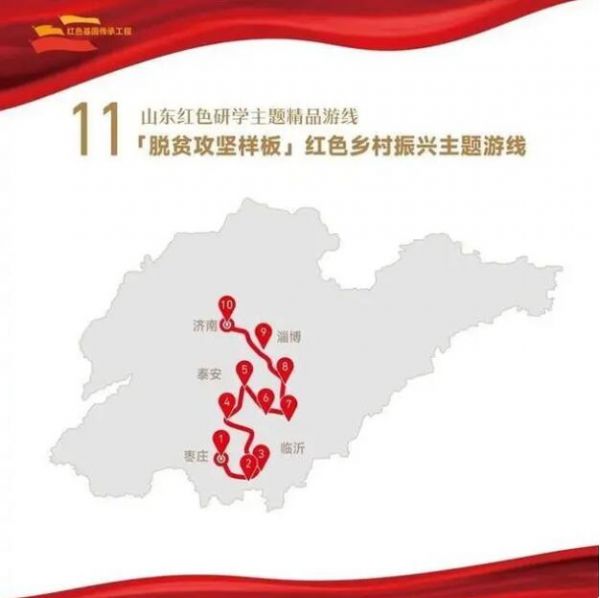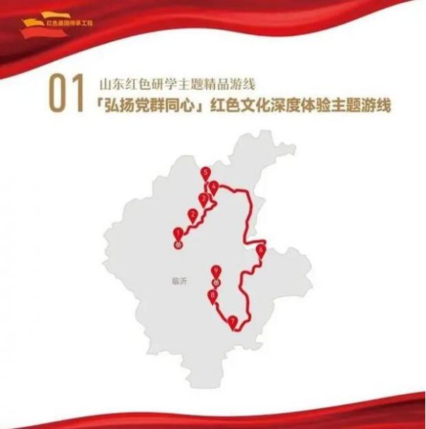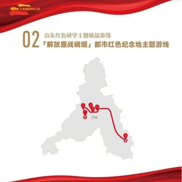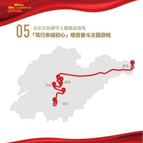 1. 菏澤市湖西人民會議廳舊址——2.濟寧市翟莊黨支部舊址——3.棗莊市滕州微山湖紅荷濕地景區(qū)——4.棗莊市津浦鐵路臨城站舊址——5.濟寧市微山湖旅游區(qū)——6.濟寧市微山縣劉少奇過湖處遺址——7.煙臺市招遠羅山黃金生態(tài)旅游區(qū)