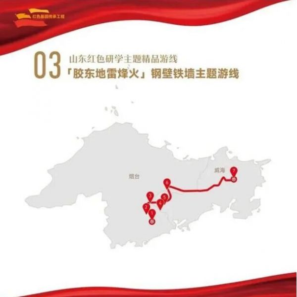 1. 煙臺市地雷戰(zhàn)旅游景區(qū)——2.煙臺市海陽地雷戰(zhàn)紀念館——3.煙臺市八路軍膠東軍區(qū)機關(guān)舊址——4.威海市馬石山烈士陵園——5.威海市紅色密營(下石硼村)——6.威海市膠東育兒所——7.威海市文登天福山革命遺址