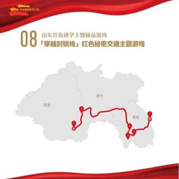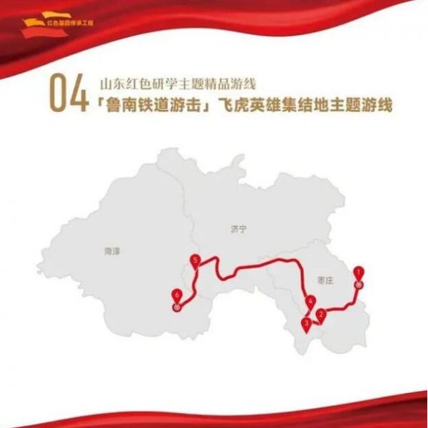 1. 棗莊市八路軍抱犢崮115師紀念園——2.棗莊市白樓灣運河支隊記憶館——3.濟寧市微山湖旅游區(qū)——4.棗莊市鐵道游擊隊景區(qū)——5.濟寧市魯西南戰(zhàn)役紀念館——6.菏澤市湖西革命烈士陵園