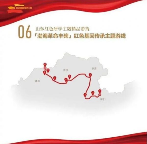 1. 濰坊市大家洼紅色革命研學基地——2.濰坊市壽光牛頭鎮(zhèn)抗日武裝起義陳列館——3.東營市紅色劉集旅游景區(qū)——4.東營市渤海墾區(qū)革命紀念館——5.濱州市渤海革命老區(qū)紀念園——6.濱州市渤海革命老區(qū)機關(guān)舊址——7.濱州市渤海革命老區(qū)兵器博物館——8.德州市冀魯邊區(qū)革命紀念園——9.德州市八路軍冀魯邊區(qū)抗戰(zhàn)郵局舊址——10.德州市北海銀行冀魯邊區(qū)分行舊址