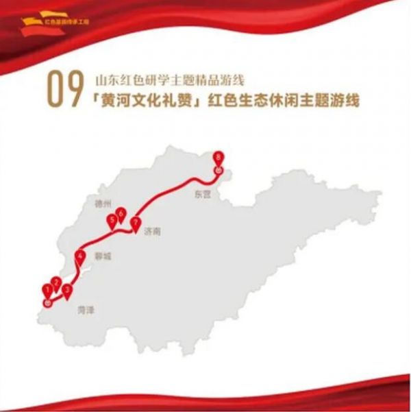 1. 菏澤市冀魯豫黃河水利委員會舊址——2.菏澤市高村黃河歷史文化苑(菏澤黃河水利風景區(qū))——3.菏澤市江蘇壩保衛(wèi)戰(zhàn)遺址——4.聊城市劉鄧大軍強渡黃河戰(zhàn)役紀念園——5.德州市齊河黃河水鄉(xiāng)國家濕地公園——6.德州市齊河時傳祥紀念館——7.濟南市黃河文化展館——8.東營市黃河口生態(tài)旅游區(qū)
