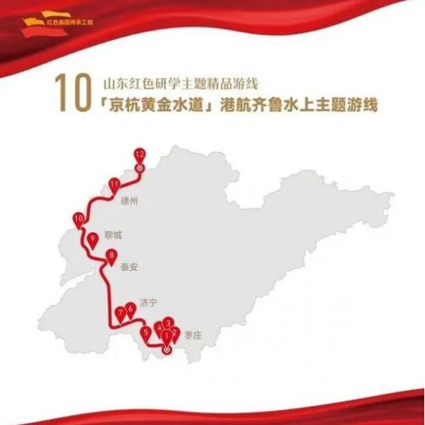 1. 棗莊市臺兒莊古運河——2.棗莊市臺兒莊古城——3.棗莊市臺兒莊大戰(zhàn)紀念館——4.棗莊市臺兒莊運河國家濕地公園——5.濟寧市微山湖旅游區(qū)——6.棗莊市微山湖紅荷濕地景區(qū)——7.濟寧市微山湖南陽古鎮(zhèn)——8.泰安市東平湖旅游區(qū)——9.聊城市孔繁森同志紀念館——10.聊城市臨清運河鈔關(guān)——11.德州市普利森機床博物館——12.德州市樂陵大桑樹村