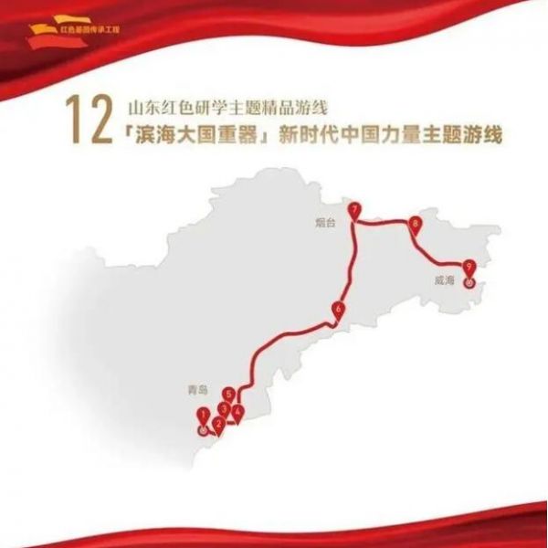 1. 青島市海信工業(yè)旅游基地——2.青島市青島港工業(yè)旅游基地——3.青島市中國人民解放軍海軍博物館——4.青島市奧帆中心(上合峰會會展中心)——5.青島市海爾世界家電博物館——6.煙臺市海陽東方航天港——7.煙臺市“耕海1號”海洋牧場綜合體——8.威海市威高集團——9.威海市榮成國家電投新能源科技館