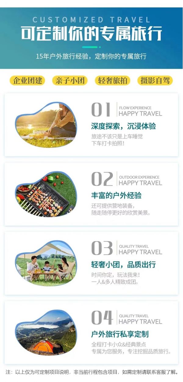 私人訂制:我們業(yè)務(wù)范圍囊括了全國各大城市,川西、西北、西藏、新疆,在路上永遠(yuǎn)有我們的身影。我們將為每一個有定制需求的你策劃出獨(dú)屬于自己的完美旅行。