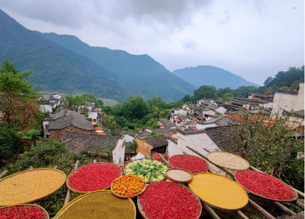 抵達篁嶺后,先前往篁嶺古村。這里有錯落有致的徽派建筑,還有聞名的“曬秋”景觀。清晨的陽光灑在層層疊疊的曬匾上,色彩斑斕的農作物構成了極具特色的畫面。在古村的街巷中穿梭,拍攝古民居的木雕、磚雕、石雕等精美的建筑細節。