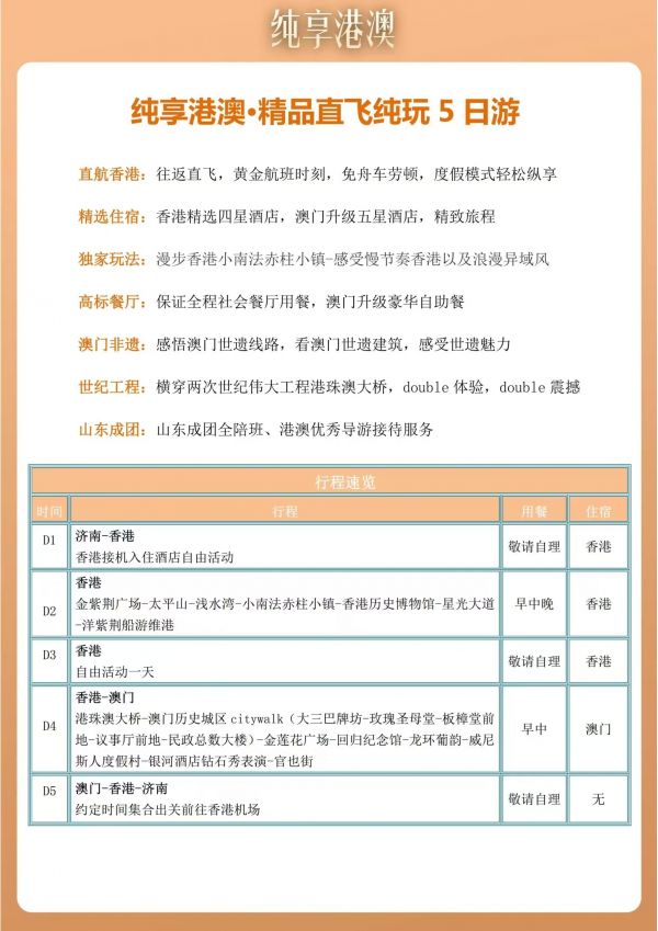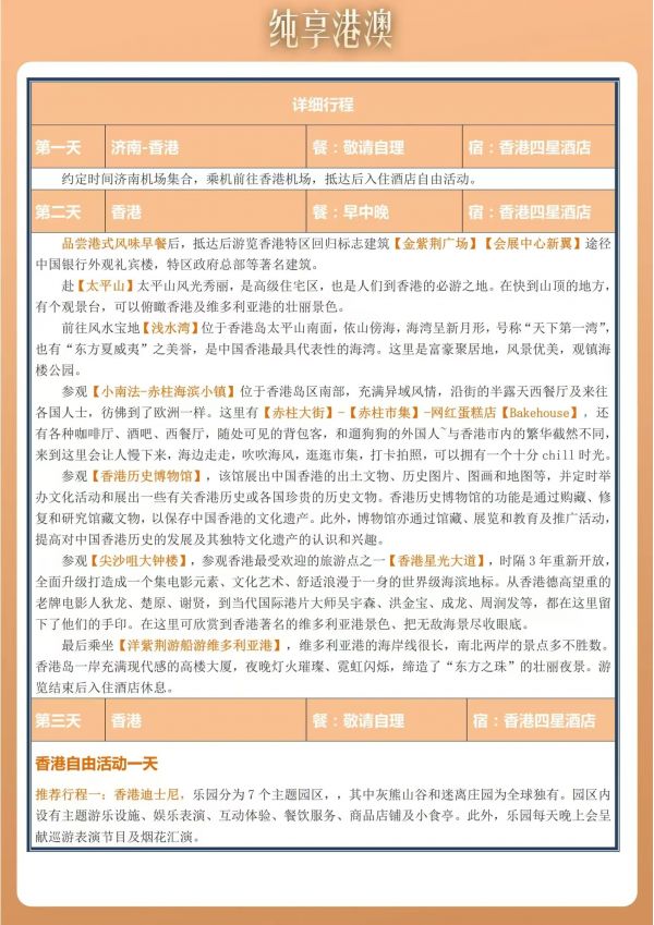 香港澳門屬亞熱帶季風氣候,旅游鞋是最方便,陽光很熱情,所以防曬用品墨鏡、太陽傘、防曬霜是必備。目前香港澳門溫度 13-20 度,建議根據(jù)天氣變化準備衣物。天氣變化無常請備好雨具。