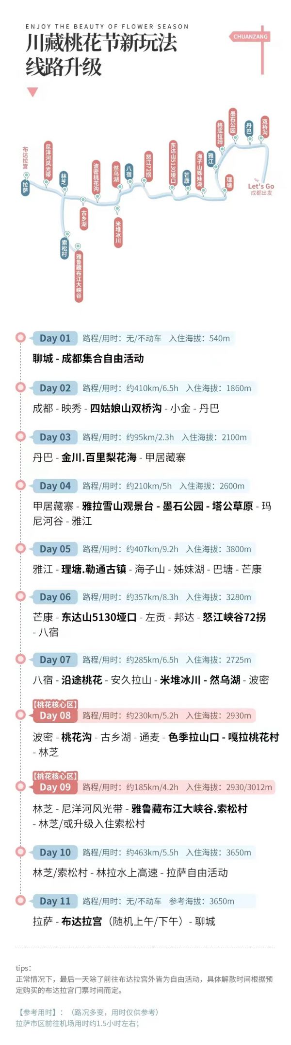 (桃花核心區)波密 - 桃花溝 - 古鄉湖 - 通麥 - 魯朗 - 色季拉山口(南迦巴瓦最佳觀景臺)- 嘎拉桃花村 - 林芝