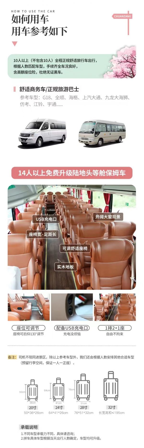 用車:15人及以上立即升級保姆車出行;為保證成團及質量,根據人數派不同座位數用車,保證每人一正座;包含司機一名、油費、:過路費、停車費,包含從出發地到景點及酒店費用,不包含晚間自由活動交通;