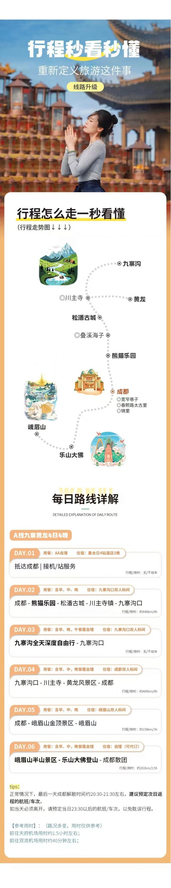 贈送:九寨溝景區旅拍2張精修+底片全送(電子版)、峨眉山溫泉體驗、川劇變臉表演晚會、專業旅游意外險(不含財產險)、2人以上24H成都雙流機場接機/成都市區車站接站