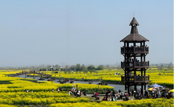 早上我們前往“中國最美的油菜花?!暴ぉ?/span>【千島菜花風(fēng)景區(qū)】,千島菜花景區(qū)被稱作“中國最美的水上油菜花”三月至四月便是此最美的季節(jié),座落在河網(wǎng)縱橫的缸顧?quán)l(xiāng),一條條的小河又分支出一條條的小溝,南北東西延伸開去,把一整塊的田分列割成了千百個“小島”,這種“小島”興化人把它稱作“垛”。垛子只比水面高出一點(diǎn)點(diǎn),整齊劃一地排著,就像是列隊(duì)檢閱的方陣,氣勢恢宏,波瀾壯闊,登上20多米高的觀光瞭望臺,極目遠(yuǎn)眺,滿眼盡是金黃色的菜花,形成一道獨(dú)特的自然風(fēng)景,身臨其境,心曠神怡;