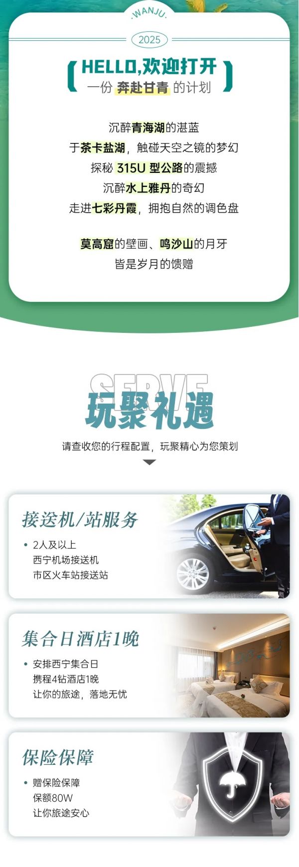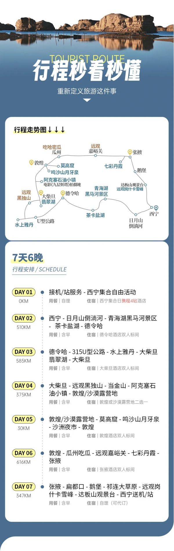 門票:包含茶卡鹽湖門票、鳴沙山月牙泉門票、張掖七彩丹霞門票、青海湖黑馬河門票、大柴旦翡翠湖門票