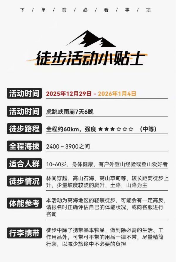 徒步路線較為偏遠,條件有限,主辦方有權根據具體房態進行調整