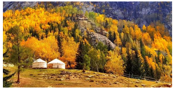 順著額爾齊斯河河谷前行,一座通體由花崗巖構成的奇峰拔地而起,因形似巨鐘倒扣河畔,故而得名“神鐘山”。它巖壁陡峭,秋陽中泛著淡淡的米黃。河水在“石鐘”旁邊蜿蜒流淌,清澈的水波載著搖晃的倒影流向北冰洋。站在觀景臺遠眺,山與水相映成趣,風聲與水聲交織成曲,讓人忍不住放慢腳步,生怕驚擾了這份靜謐。而額爾齊斯河峽谷的秋色更顯磅礴,兩岸的次生林褪去翠綠,換上深淺不一的金與紅,河谷間云霧繚繞時,遠山如黛,近樹似金,宛如一幅流動的油畫,每一筆都蘊藏著大自然的匠心獨運。