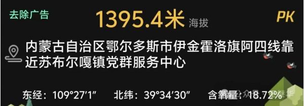 今天早晨起床搜百度這里海拔1395.4米在內(nèi)蒙古自治區(qū)鄂爾多斯市伊金霍洛旗阿四線靠近蘇布爾嘎鎮(zhèn)黨群服務(wù)中心東經(jīng):109°27'1”北緯:39°34'30"含氧量:18.72%