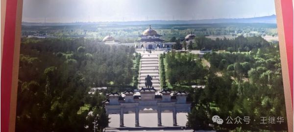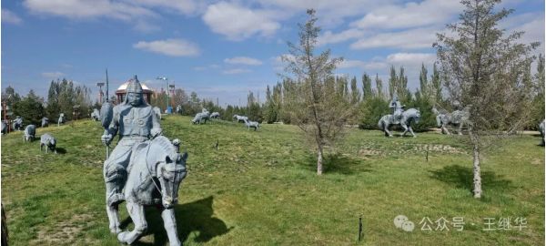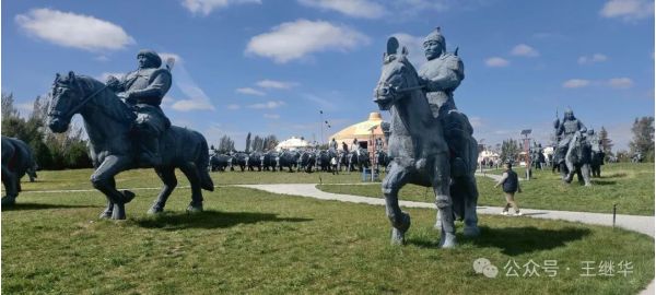 陵宮主殿的穹頂靜臥在碧草間,像一顆不慎落在綠毯上的珍珠。據說1954年國家就撥款興建了這座陵寢,走進大門,12.5米高的成吉思汗騎馬雕像立在中央,像從天而降無比威武,他的目光越過遠方,仿佛仍在凝視親手開拓的疆域。