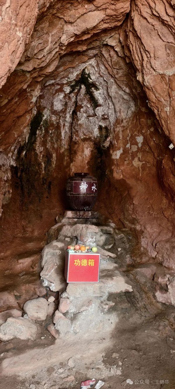 尋到神水洞時,因是陰天,光線稍暗,卻絲毫不影響清冽的泉水從巖縫滲出,滴落在下方石罈里,泛著細(xì)碎漣漪。掬一捧泉水入口,涼意順著喉嚨往下淌,瞬間驅(qū)散了徒步的微熱。