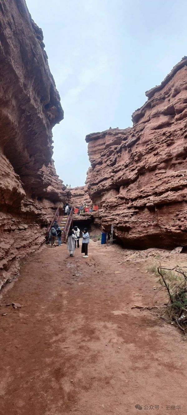站在洞前回望,峽谷兩側(cè)的巖壁在晨光里愈發(fā)鮮亮,深紅色的砂礫巖襯著藍(lán)天白云,像一幅精心暈染的油畫。