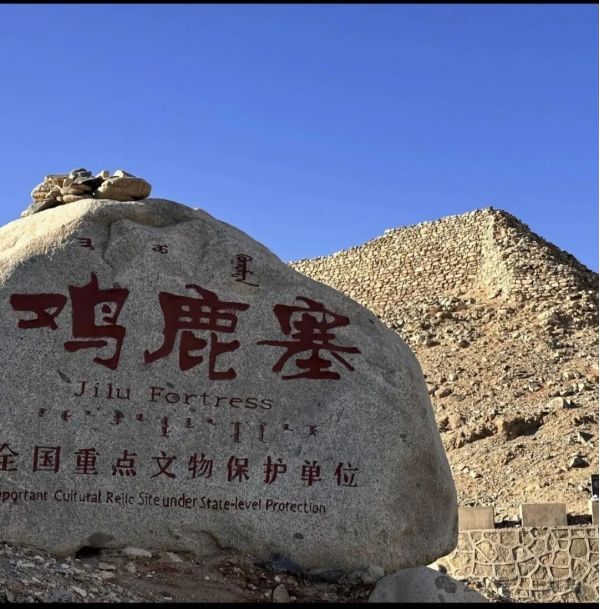 再往前便是“雞鹿塞,”它位于磴口縣狼山哈日嘎納峽谷南口,是漢朝通塞北的險要隘口,亦屬全國重點(diǎn)文物保護(hù)單位。城塞用自然石塊壘砌,呈方形,邊長68.5米,僅南墻開門且設(shè)甕城,內(nèi)側(cè)有馬道,四角有角臺,城內(nèi)北部還留存石砌房基。