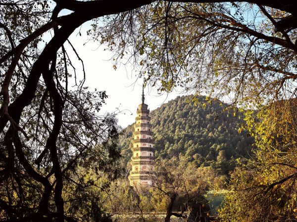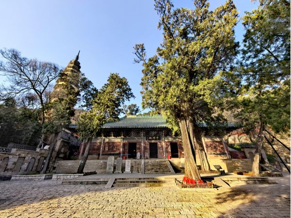 穿過千佛殿,辟支塔的身影在蒼松翠柏間傲然挺立。這座11層的樓閣式磚塔高約54米,塔身雕飾精美,每層都有錯落有致的門窗和欄桿,塔頂的相輪寶蓋在陽光下熠熠生輝。