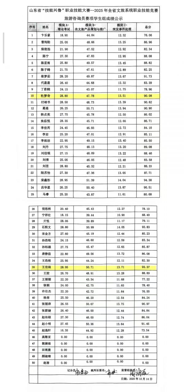 12月14日,2025年山東省“技能興魯”職業技能大賽全省文旅系統旅行社咨詢員賽項圓滿落幕,聊城職業技術學院學生表現亮眼,在劉寶平老師和李雁老師的辛勤指導與精準賦能下,王佳琪斬獲一等獎,杜夢奇榮獲二等獎。