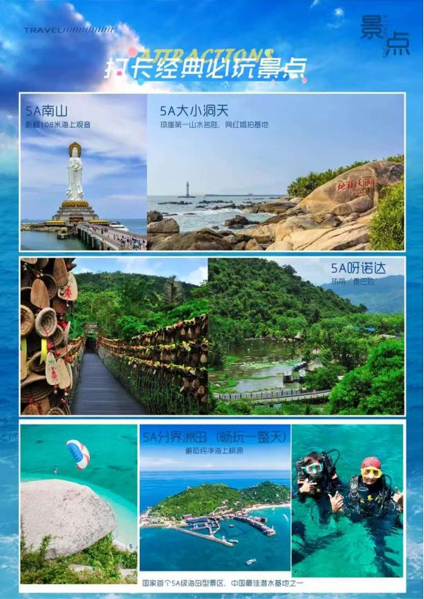 【大小洞天】國家5A級景區(時間不少于120分鐘):至今已有800多年歷史。大小洞天融匯了秀麗的海景、山景和石景,既可以看到“小洞天”、“海山奇觀”、“仙人足”等摩崖石刻,還能參觀號稱植物中的“活化石”南山不老松。【天涯海角】國家5A級景區(游覽時間不少于120分鐘):情侶們神往的圣地,不僅有南天一柱,日月神石,豐富的打卡點能戳中你所有的浪漫神經,小紅書火出圈的天涯書局、火車、情侶樹,還有婚拍基地的教堂、熱氣球、粉色城堡都超級出片。