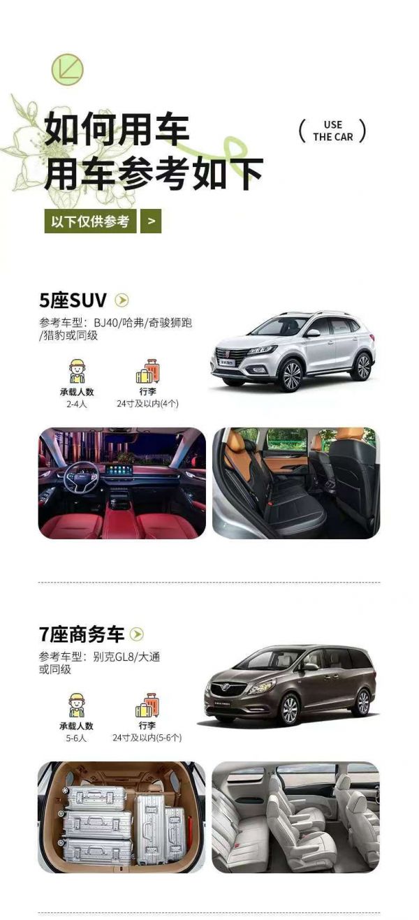 為保證成團及質量,根據人數派不同座位數用車,保證每人一正座;