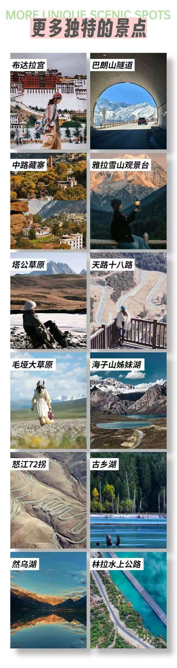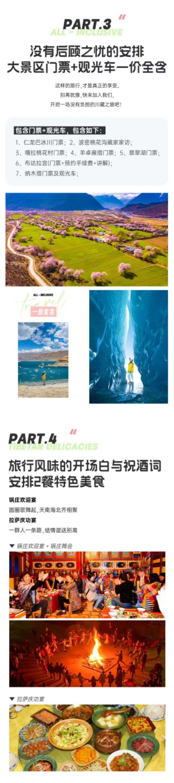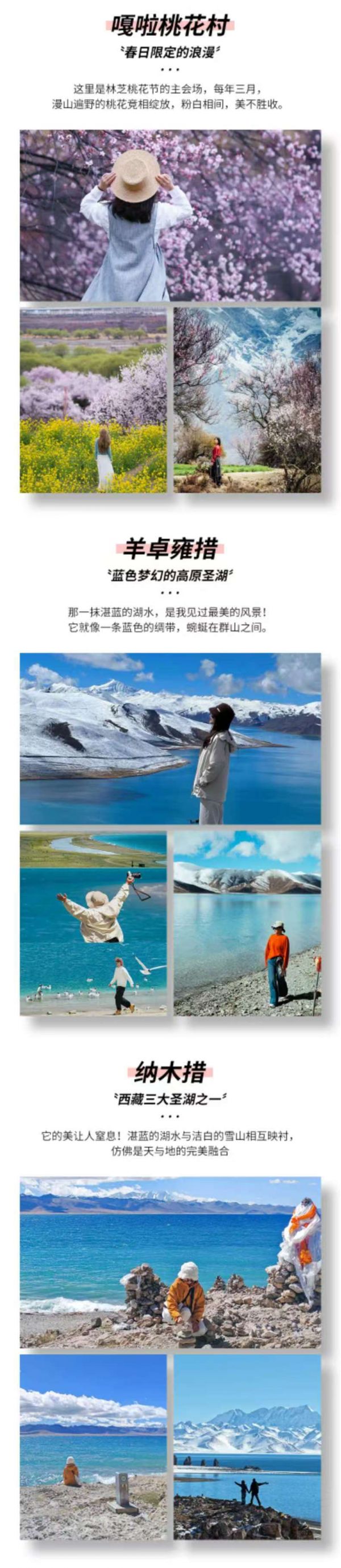 仁龍巴冰川門票、波密桃花溝藏家家訪、嘎拉桃花村門票、秀巴千年古堡門票、布達拉宮(門票+預約手續費+講解)、羊卓雍措門票、納木措門票及觀光車、翡翠湖門票